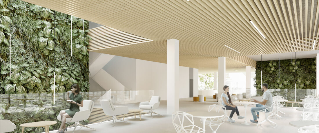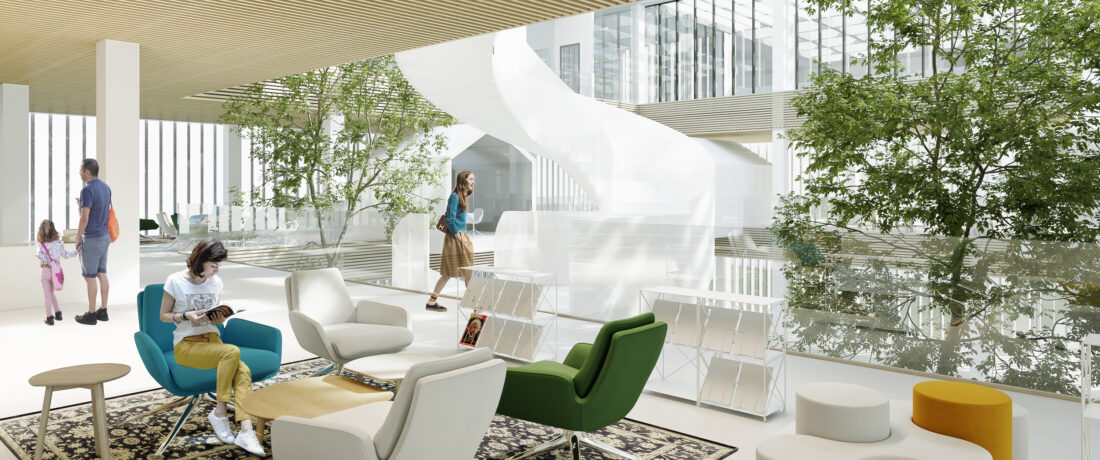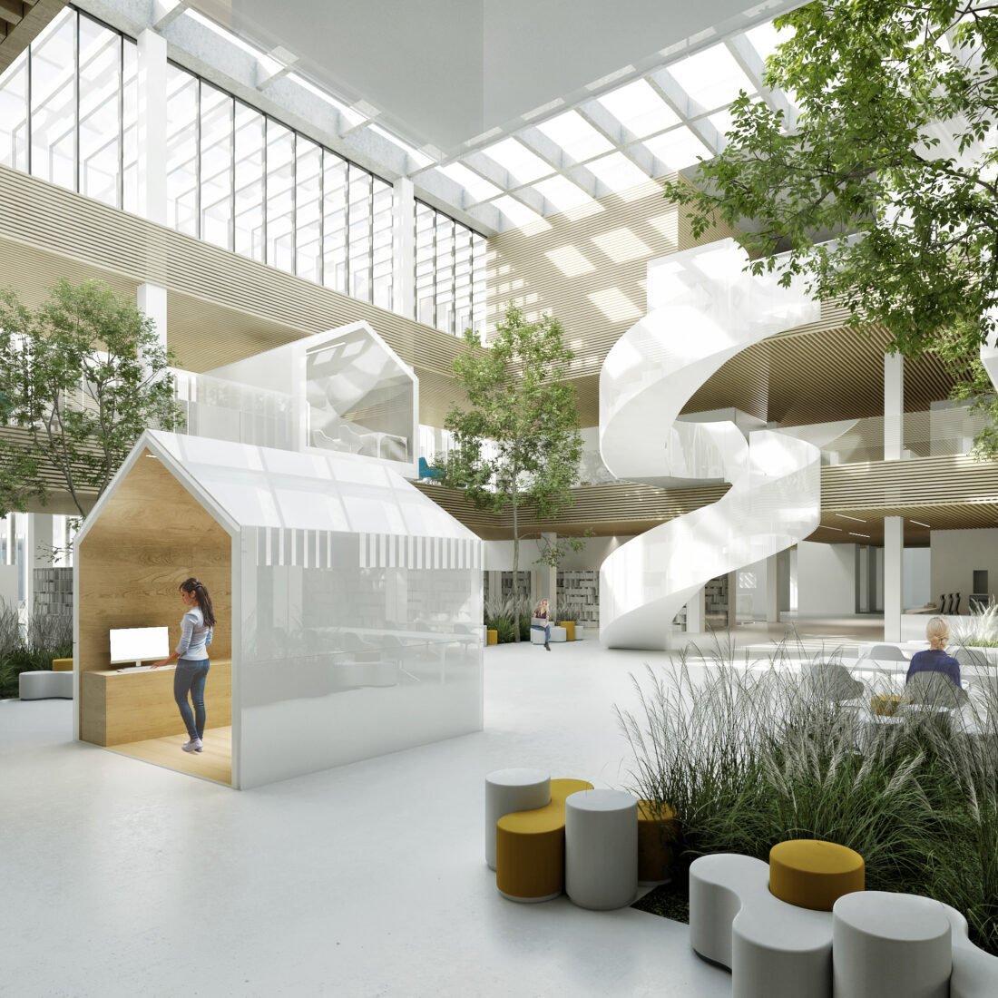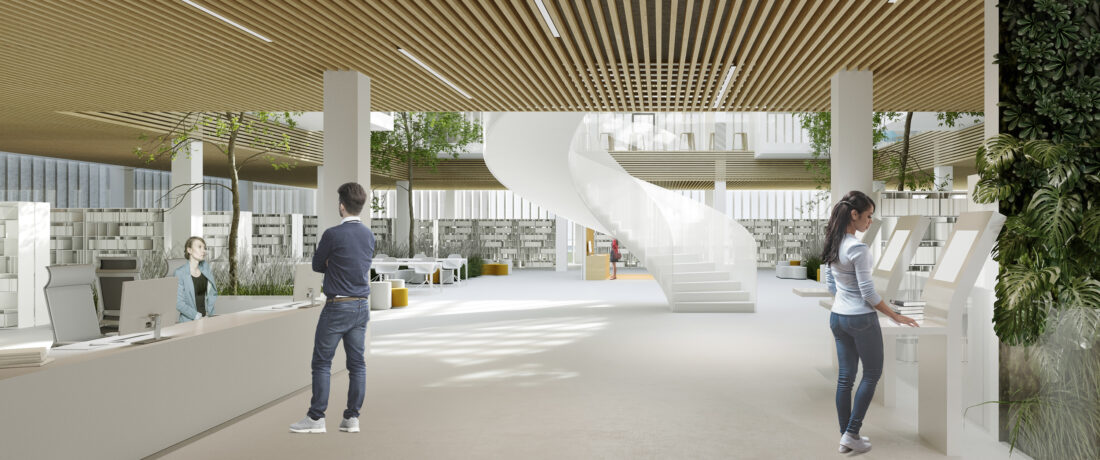 Część centralną budynku Cognitarium stanowi zielone atrium, wokół którego rozbudowane zostały główne funkcje biblioteki, tj. wypozyczalnia, czytelnia, pokoje do pracy indywidualnej, zespołowej oraz ideabox. Funkcje te rozłożone zostały na 3 kondygnacjach. Na styku tych funkcji znajdują się strefy z obsługą biblioteczną, przy której to znajduje się pionowa strefa transportu książek (małe windy towarowe) oraz ogólna strefa wind obsługujących (oddzielnie) pracowników biblioteki oraz uzytkowników.