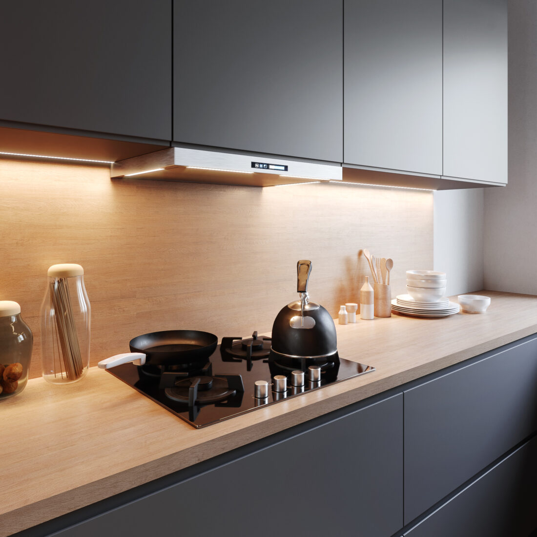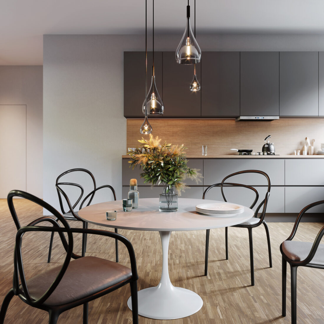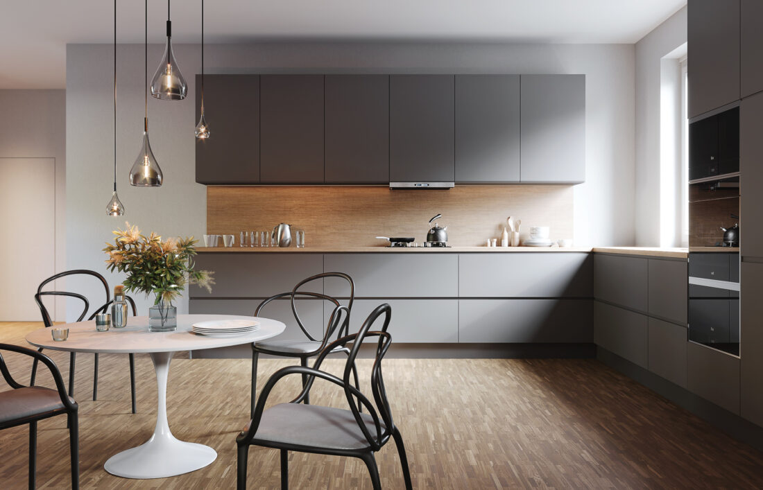 Wnętrze aneksu kuechennego z minimalistyczną zabudową kuchenną. Całość ocieplona drewnianymi dodatkami.