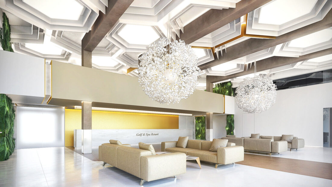 Połączenie złota, szlachetnego drewna i bieli- koloru tej dyscypliny sportowej. Dodatkowa zieleń w formie ogrodów wertykalnych nadaje świeżości tej przestrzeni.