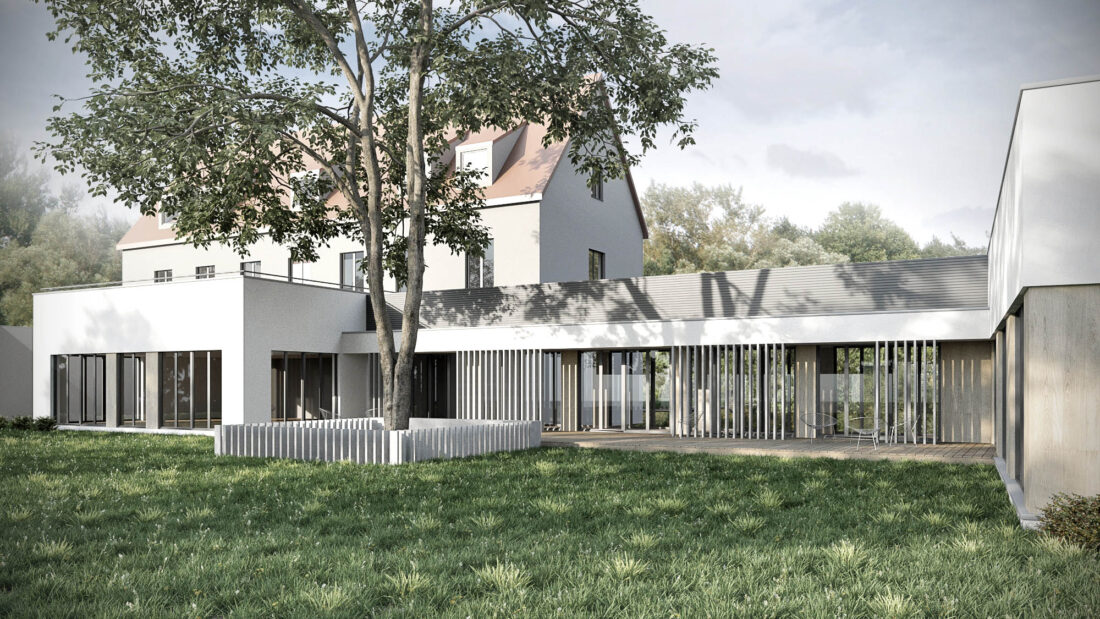 Całość kompleksu zlokalizowana w przestrzenii z dużą ilością drzew. Drzewo na froncie rozbudowy otoczone ochroną.