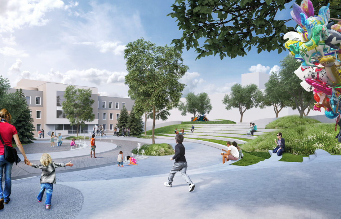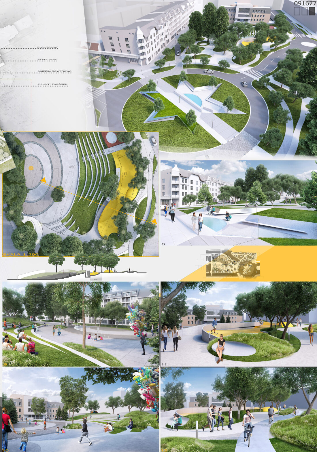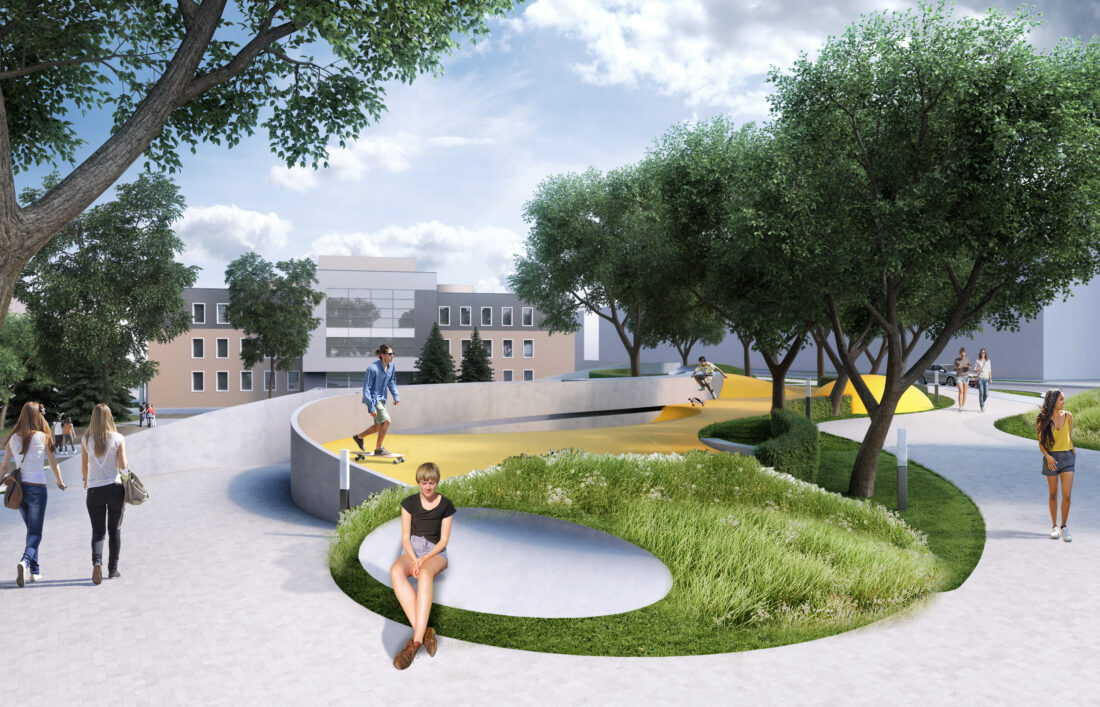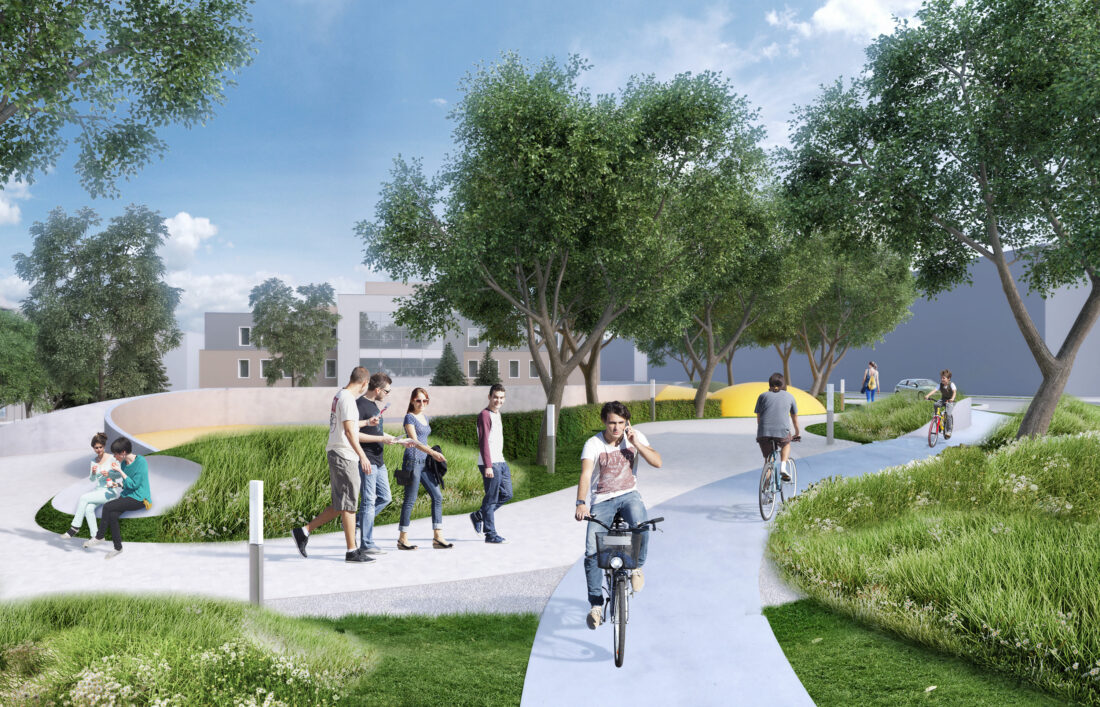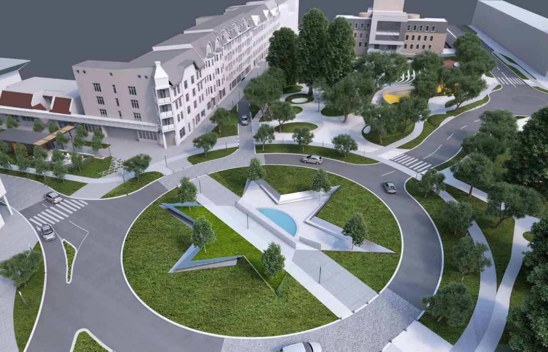 Aby przestrzeń ta była przestrzenią, z której bardzo chętnie się korzysta, to projektowana jest duża ilość zieleni, która jednocześnie izoluje od hałasu spowodowanego ruchem samochodowym, jak i również wytwarzałaby korzystny klimat zachęcający do tego, aby zatrzymać się, posiedzieć w cieniu drzew i odpocząć od tempa współczesnego życia w mieście.